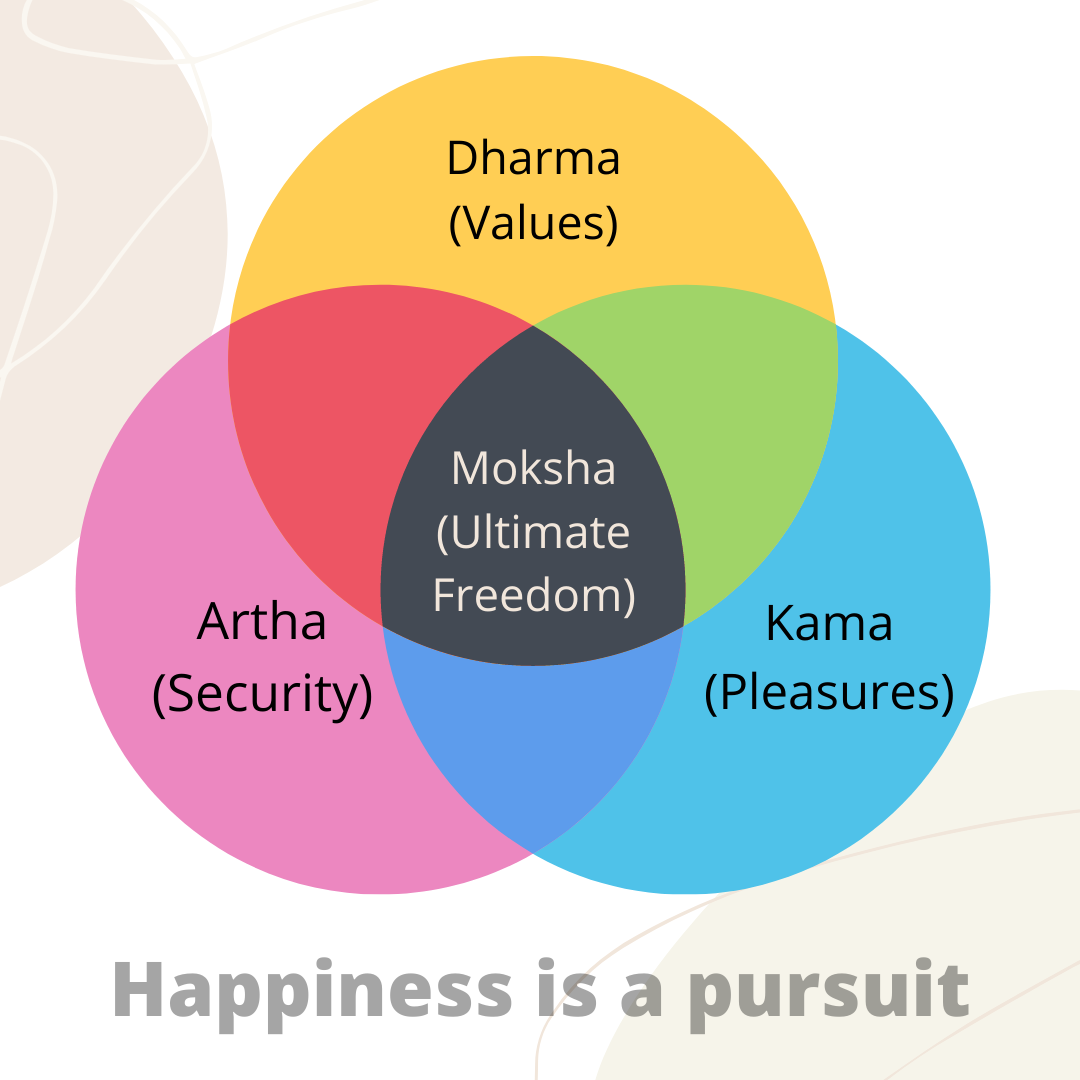 The Vedic tradition talks of four Purusharthas or Pursuits (they sound similar): Kama (Pleasure or simply Fun), Artha (Security), Dharma (Values) and Moksha (Inner Peace and Freedom). The Kama includes all forms of sensual or intellectual pleasures like novelty, food, status, romance, music, adventure and entertainment. Anything we do for fun or entertainment is Kama Artha including health, wealth, home, belongingness, security, respect and relationships. Dharma can simply be translated as universal values like equality, justice, charity and so on. Finally, Moksha is freedom- freedom from emotional suffering, dissatisfaction, craving, vices. It means true inner peace and poise.