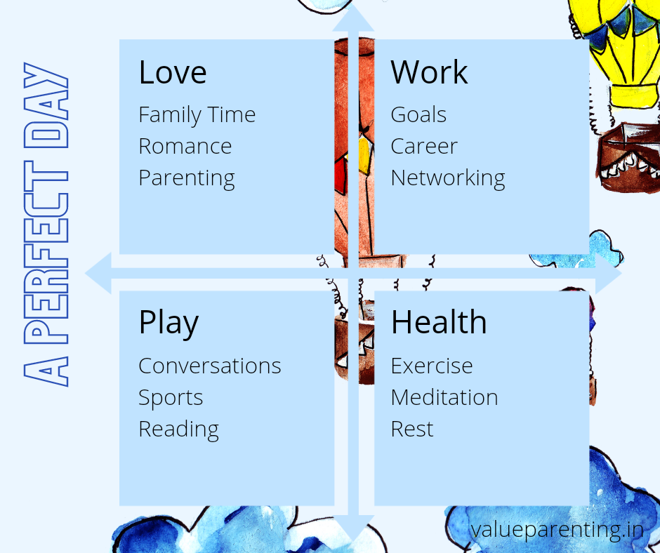 A perfect day is one in which we are able to spend time doing each of these four elements viz. love, work, play and health: